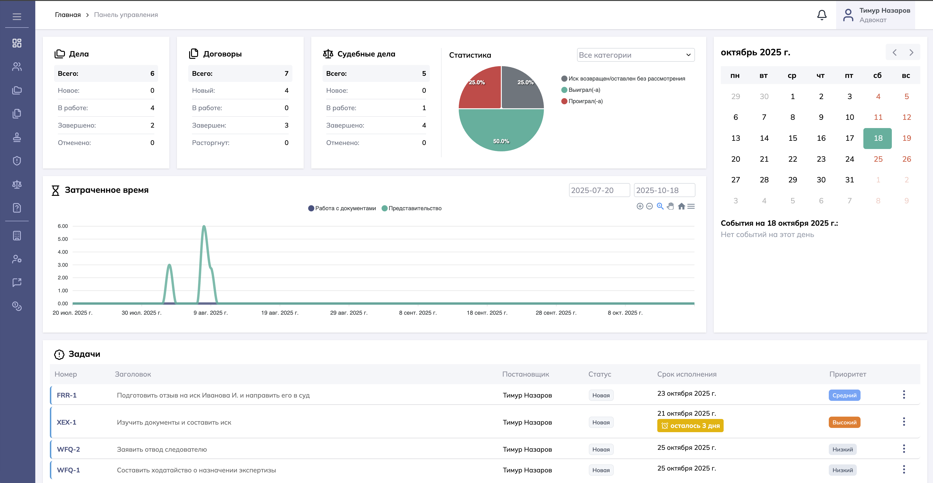 Автоматическое отслеживание сроков на обжалование судебных актов и ведение статистики выигранных дел.