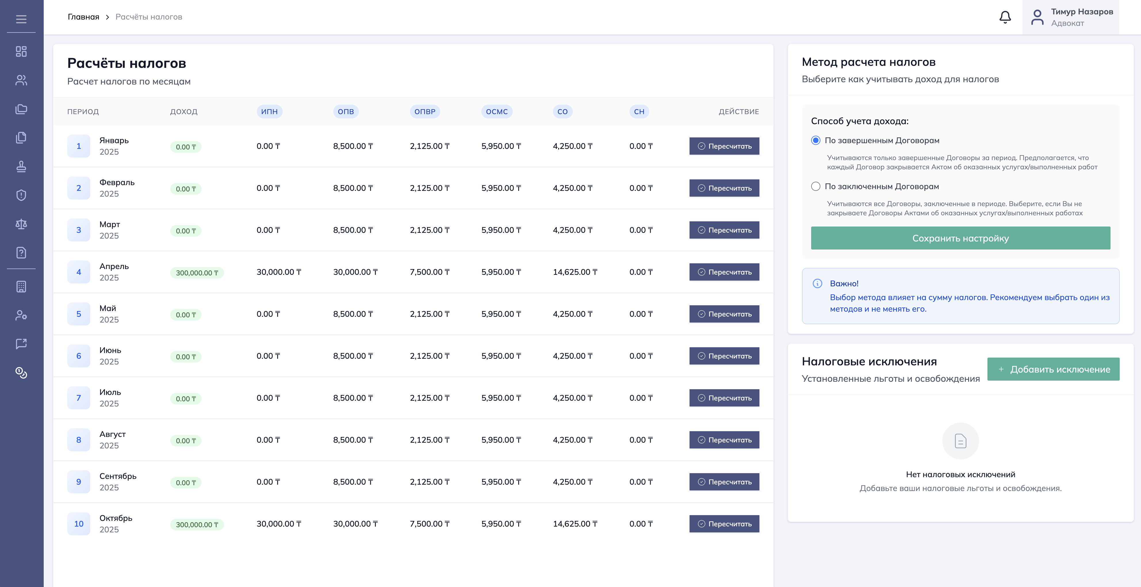 Выберите один из методов расчета налогов, укажите налоговые исключения и освобождения. Система автоматически рассчитывает налоги с учётом действующего законодательства РК, ставок и исключений. Расчёт выполняется точно на дату, с учётом статуса пользователя и применимых льгот.